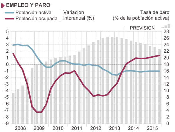 El pero es el tamaño del lastre. España acabó 2014 con 5,8 millones de parados, el 26% de toda su población activa, y la digestión de ese volumen de personas sin un trabajo requiere algo más un par de décimas de crecimiento arriba o abajo. Funcas prevé entre 2014 y 2015 el número de desempleados baje en 900.000, aunque menos de la mitad de esa reducción se deberá a la creación de empleo (400.000) mientras que los 500.000 parados menos restantes serán consecuencia de la reducción de la población activa (personas que pasen de los 65 años sin encontrar trabajo, que se marchen de España o que desistan de buscar empleo).