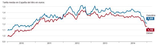 El precio medio de la gasolina esta semana (1,21 euros) era el más bajo desde noviembre de 2010. El del gasóleo (1,16 euros), el menor desde diciembre de ese mismo año. A lo largo de 2014 el diésel (el combustible más común en España, que utilizan el 60% de los vehículos) se ha abaratado 19 céntimos, un 14%. Esto significa que llenar el depósito de un coche —de 60 litros de media— cuesta 69,6 euros ahora. Al inicio del año valía 81,4 euros.La bajada de precio de las materias primas ha servido en bandeja la estrategia de marketing a las grandes superficies. Sus ofertas son agresivas, ya que el precio medio de venta en España era la semana pasada de 1,21 euros para la gasolina y 1,16 euros para el diésel, según el Boletín Petrolero de la Unión Europea. Las promociones serían imposibles si no fuera porque el barril de petróleo se ha hundido y, como consecuencia, la cotización internacional del combustible también. Desde enero el petróleo brent, de referencia en Europa, se ha abaratado más del 45%, de 112 dólares a menos de 60 dólares el barril.Por menos de un euro el litro, el diésel no solo se puede encontrar en Alcorcón. En la comunidad de Madrid es la tarifa que cuelga en los paneles de, al menos, las gasolineras de otros tres hipermercados de Alcampo y cuatro de E.Leclerc. En Girona y Tarragona también usan la misma táctica supermercados de Condis, Bonpreu —con la marca Esclatoil— o Simply. En Murcia y León se apunta la cadena E.Leclerc. Y Eroski lo hace en sus gasolineras de varias provincias, entre ellas Alicante. En Huesca es el grupo de alimentación BonÀrea el que promociona el diésel más barato: a 0,94 euros el litro junto a cuatro de sus tiendas, según la base de datos que actualiza diariamente el Ministerio de Industria.