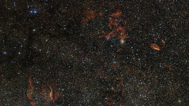 Encima del centro de la imagen puede verse una extensa nube roja de gas y polvo situada a unos 12.000 años luz de distancia, en la constelación meridional de Norma (la regla del carpintero), que se conoce como RCW 106.