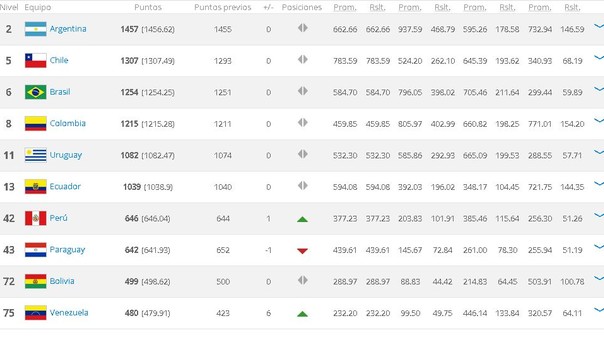 La parte alta de la clasificación FIFA sigue dominada por Bélgica, con 1.506 puntos, seguida muy de cerca por Argentina (1.457), España (1.374), Alemania (1.355) y Chile (1.307).