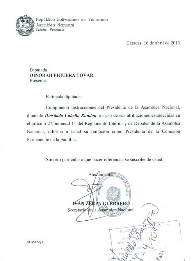 El oficio con la destitución ya se encuentra en la comisiones y está firmada por el secretario de la AN, Iván Zerpa Guerrero.