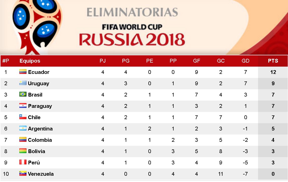 Tabla de posiciones de las Eliminatorias Rusia 2018